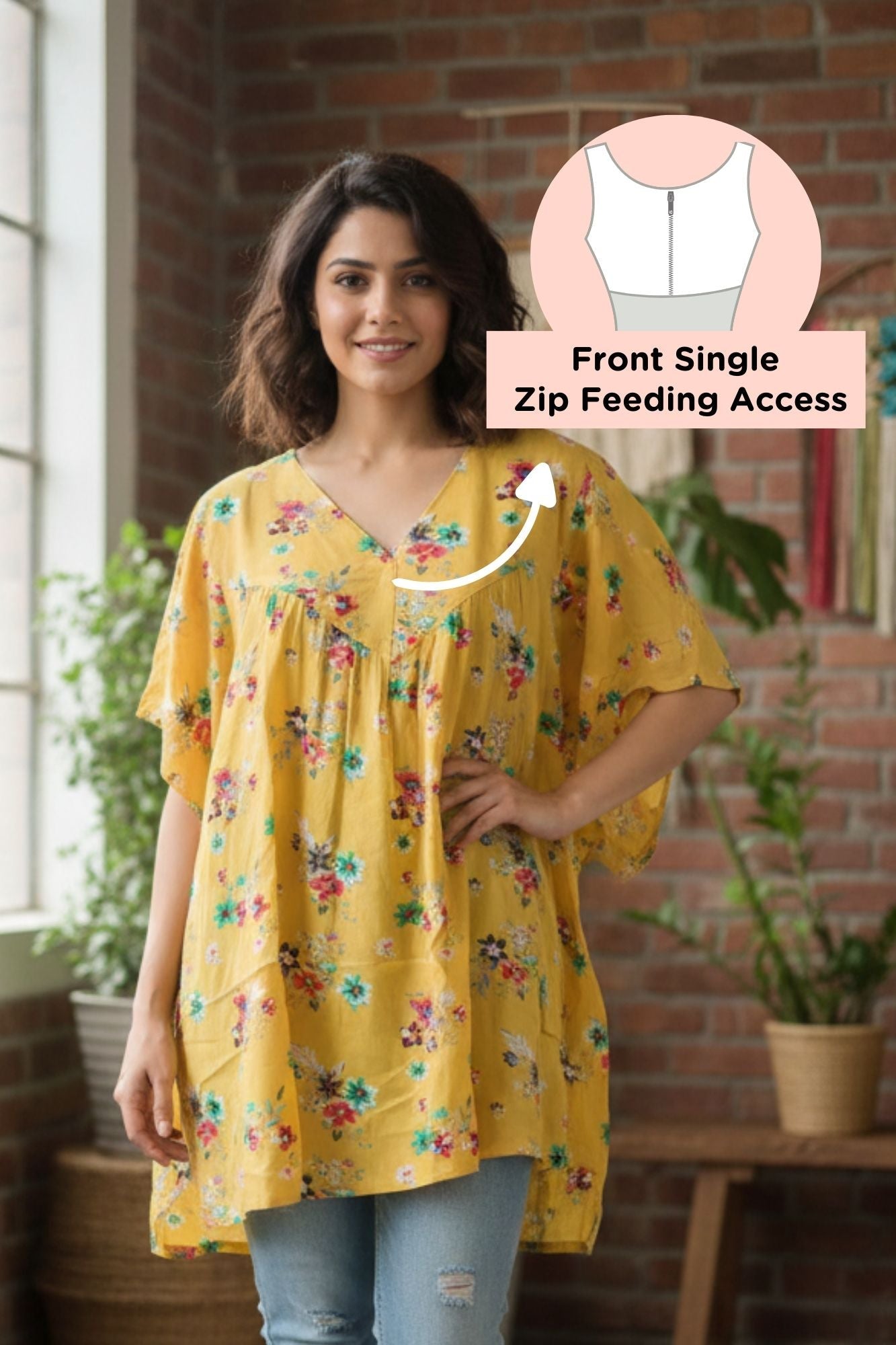 Feel effortlessly stylish in our floral printed maternity top, crafted in soft breathable cotton for all-day comfort. The relaxed design ensures comfort and style through every stage of pregnancy, while the front zipper allows easy and discreet nursing access. Perfect for work or casual outings — pair it with trousers or jeans for an effortlessly chic look.