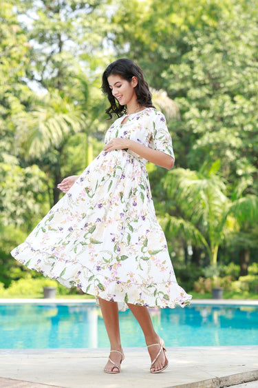 Boho Ivory Tropical Frill Concealed Zips Maternity & Nursing Dress