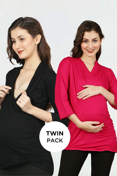 Maternity & Nursing Wrap Tops - Black & Pink Twin Pack