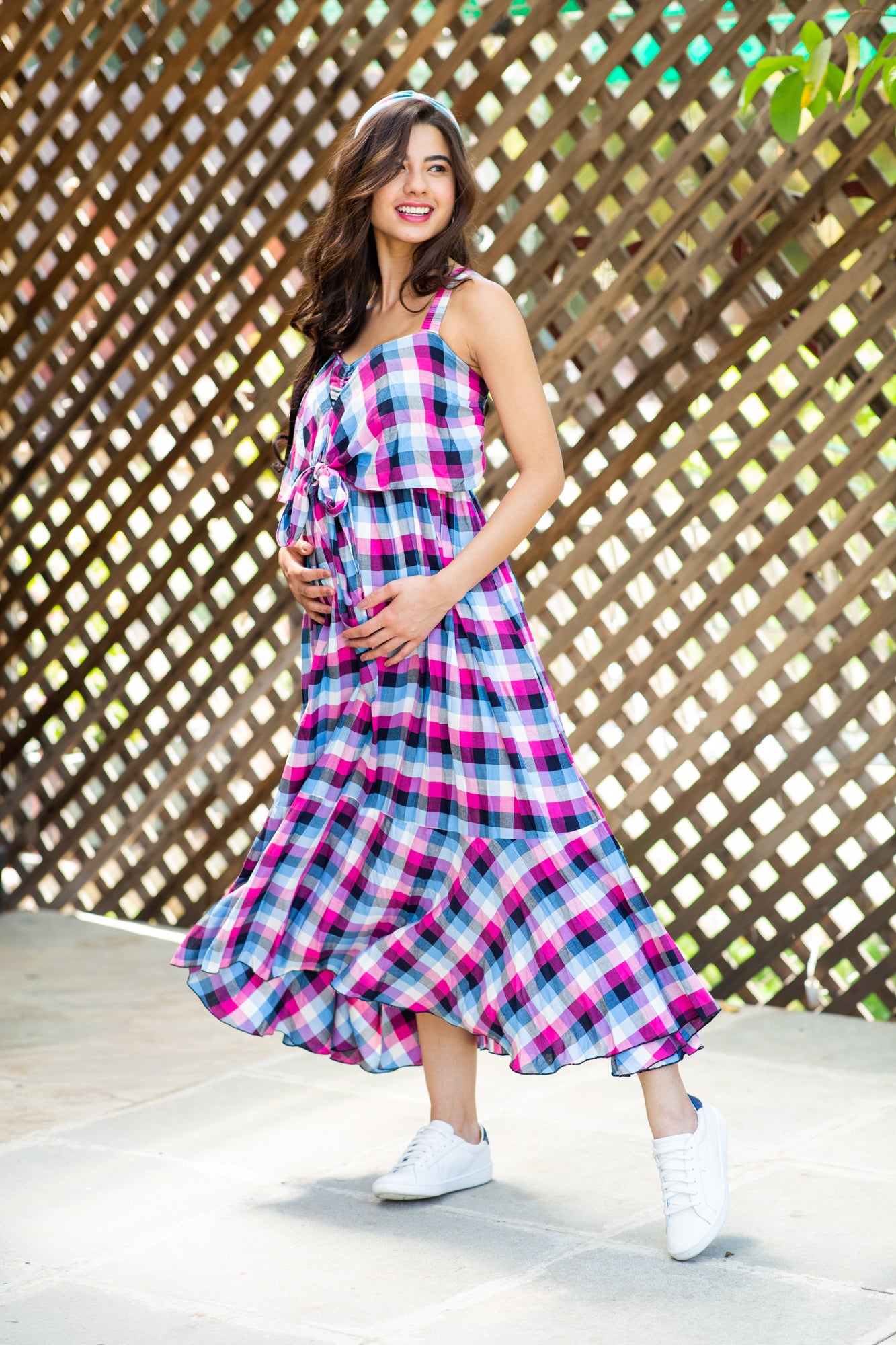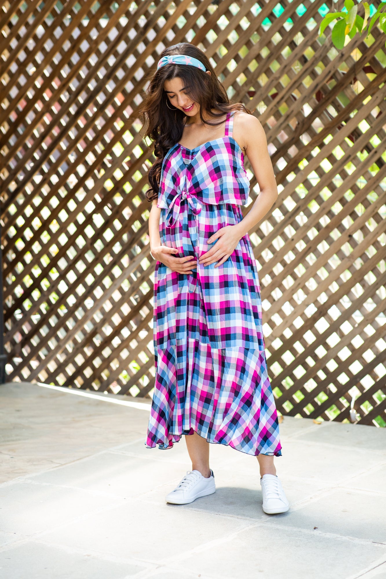 Plaids are a staple for any season and this maternity dress is an all-time favorite. This dress is a perfect pick offering a flexible fit throughout pregnancy. Made in lightweight viscose fabric, this dress is crafted to offer easy movement and easy nursing.