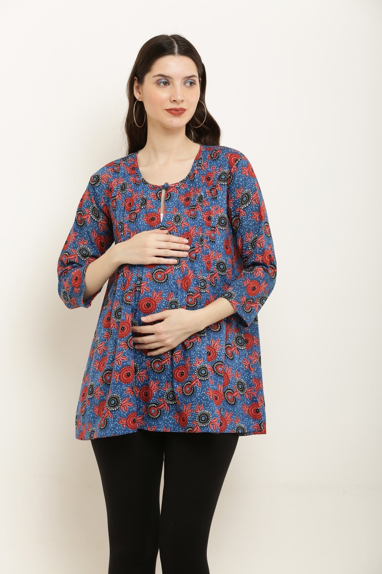 Dreamy Blue Bloom Maternity & Nursing Pintucks Top (100% Cotton)