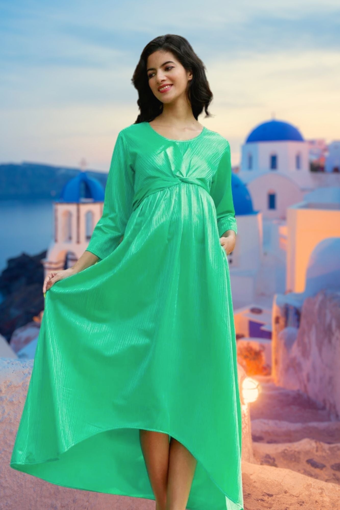 You can never go wrong with Momzjoy's knot dress that can be worn for any occasion. This dress has a great fit during and after pregnancy and flatters the bump with gathers. Made in trendy pleated fabric, you can wear this dress in all seasons. This is perfect for maternity photoshoots, baby showers, or a dinner date with your hubby.