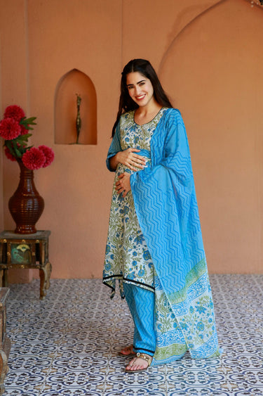 Cerulean Blooming Maternity & Nursing Kurta + Bump Band Bottom + Dupatta (3 Pc) (100% Cotton)