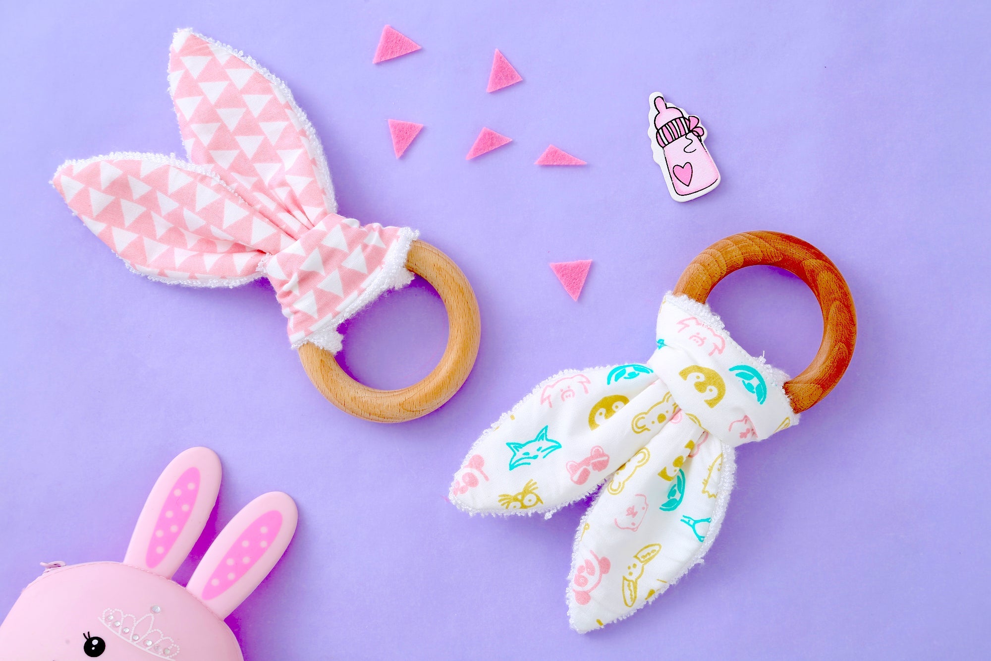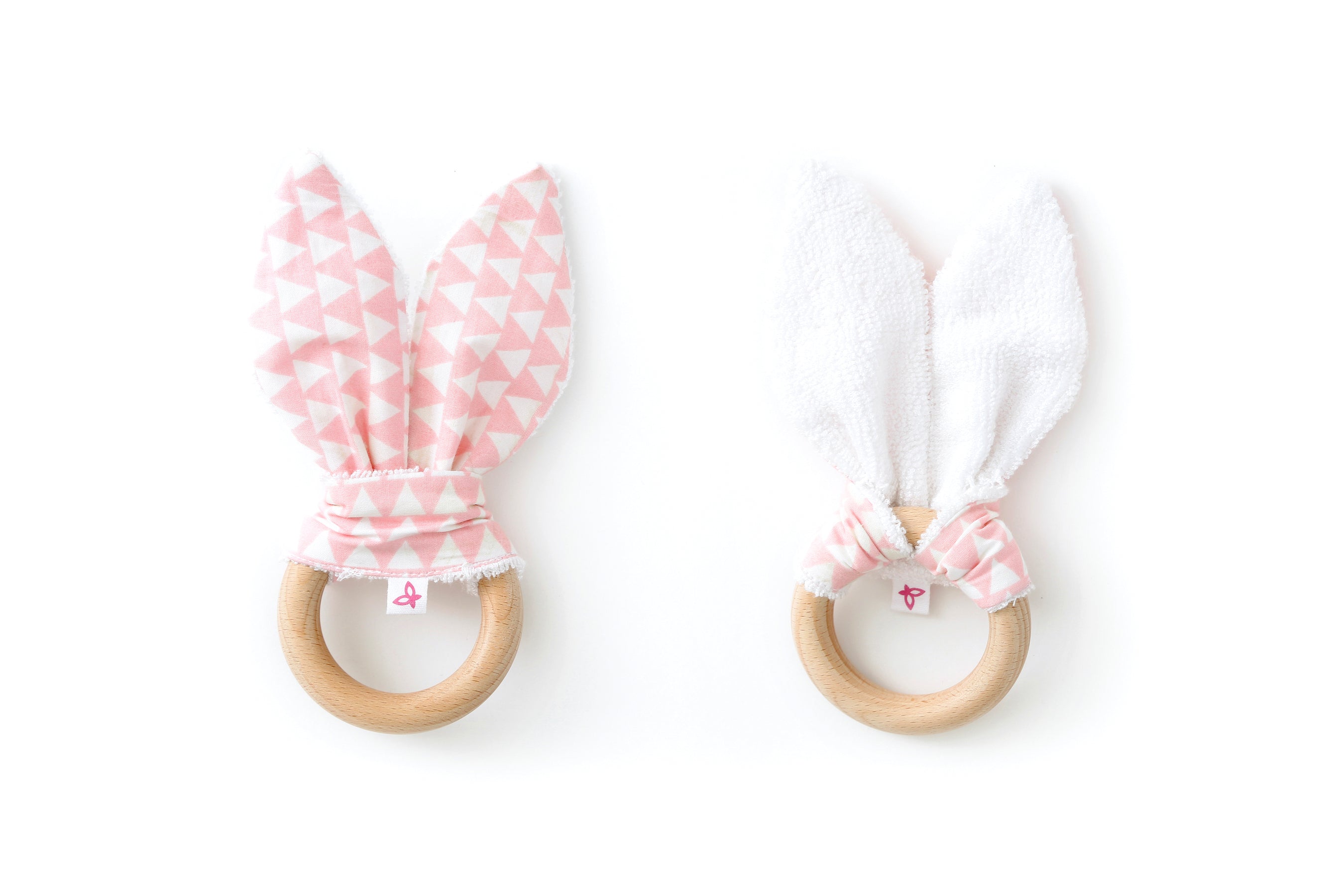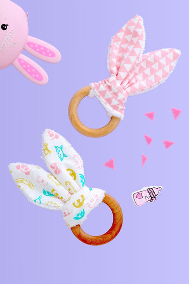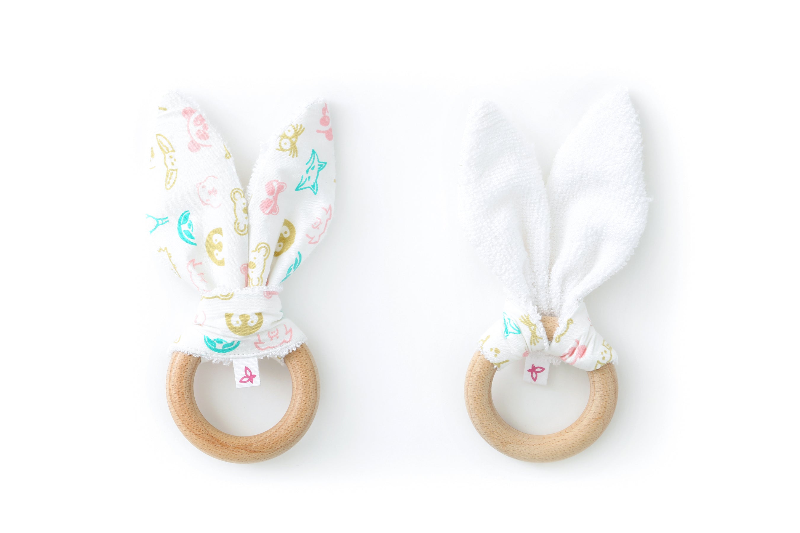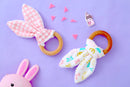 Our Bunny Teethers are made of 100% organic cotton fabric on the front, and natural bamboo terry on the back, making them super soft on the skin.