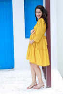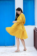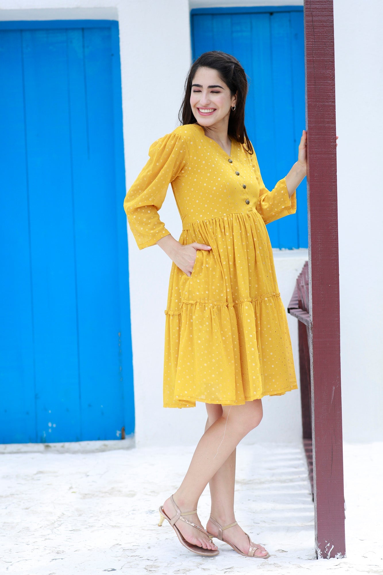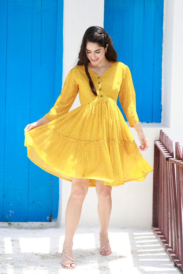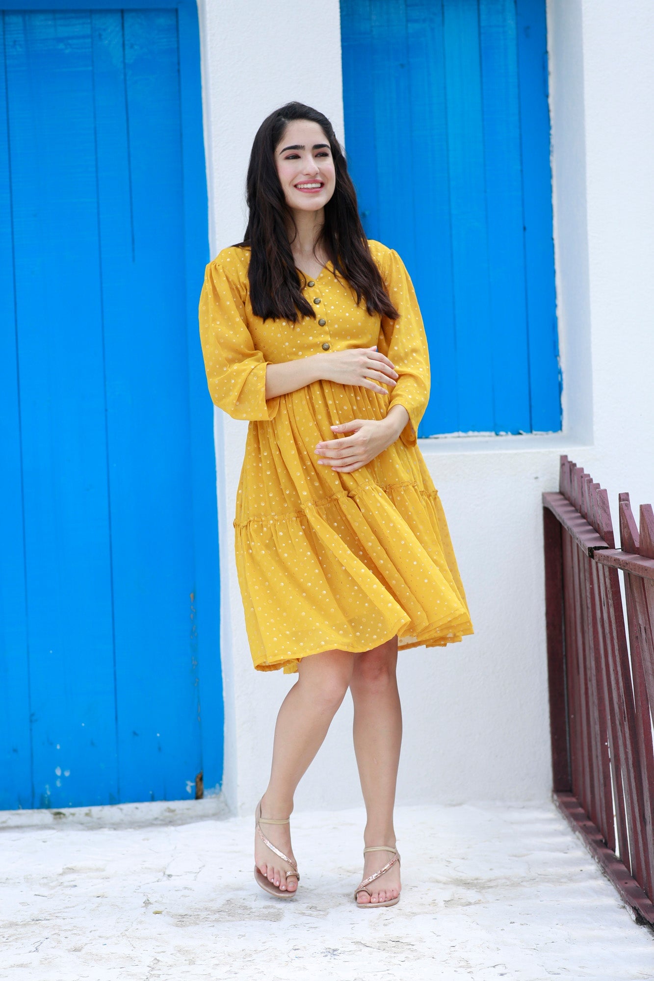 Our cute marigold dress is made in soft georgette fabric with lining and offers a flexible fit before, during, and after pregnancy. With a unique shimmer embellished design, this dress can be paired with sneakers for effortless styling.