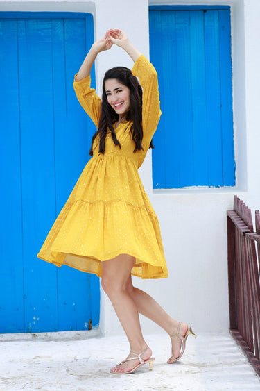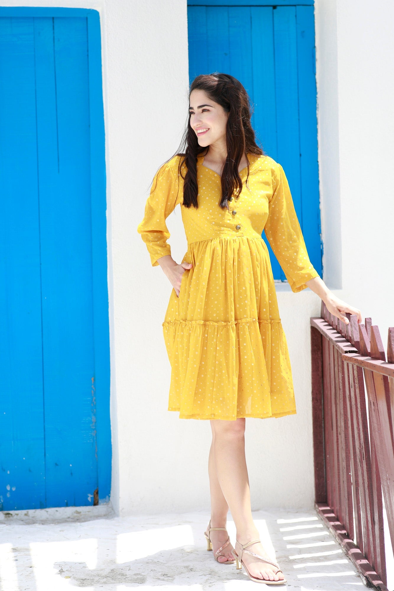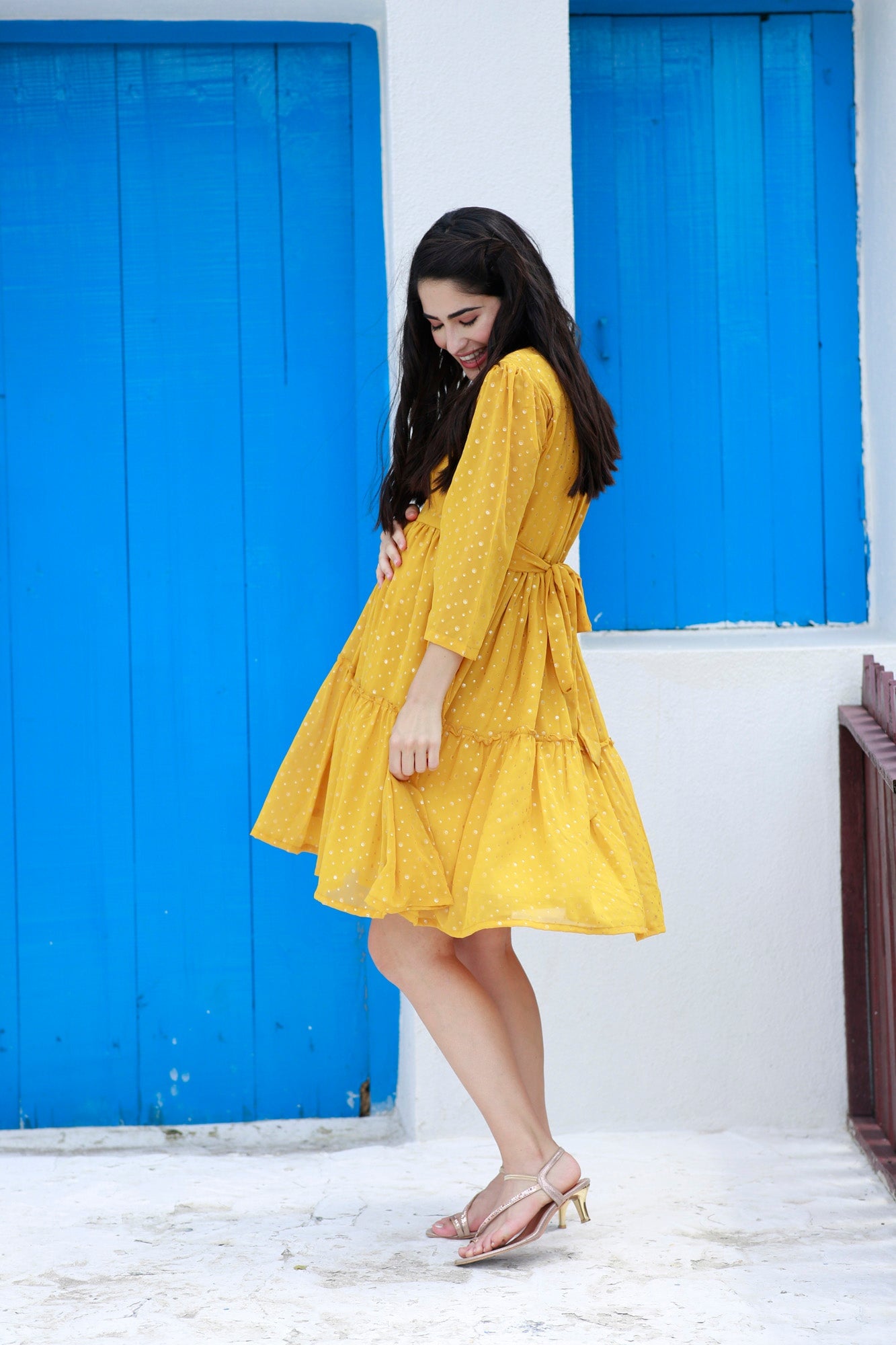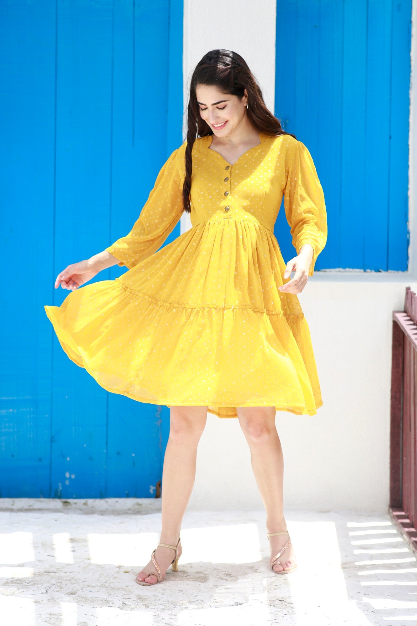 Our cute marigold dress is made in soft georgette fabric with lining and offers a flexible fit before, during, and after pregnancy. With a unique shimmer embellished design, this dress can be paired with sneakers for effortless styling.