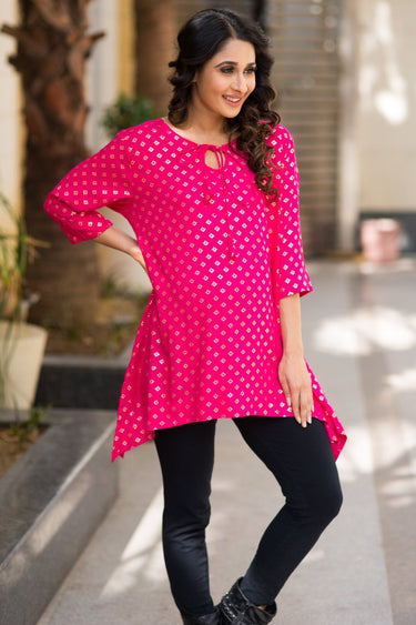 Enjoy your pregnancy in this comfortable fit maternity top made in cotton visocse blend fabric. Slide into this elegant top with smart edges that define your body. Neatly cut gold embellishments add to the look and make you stand out in the crowd. With relaxed and loose fit, this top is best for formal outings. Style it up with earrings and leggings and you are ready to enjoy breezy outings!