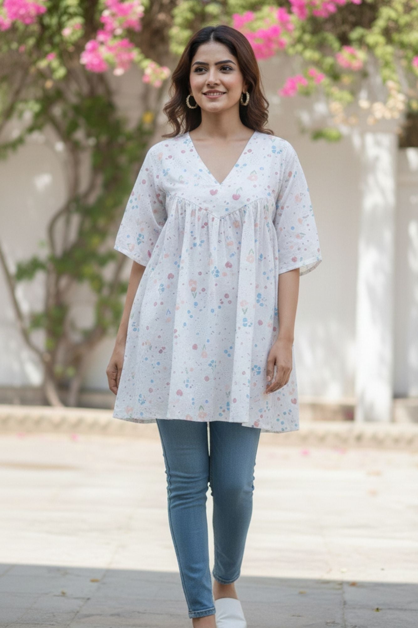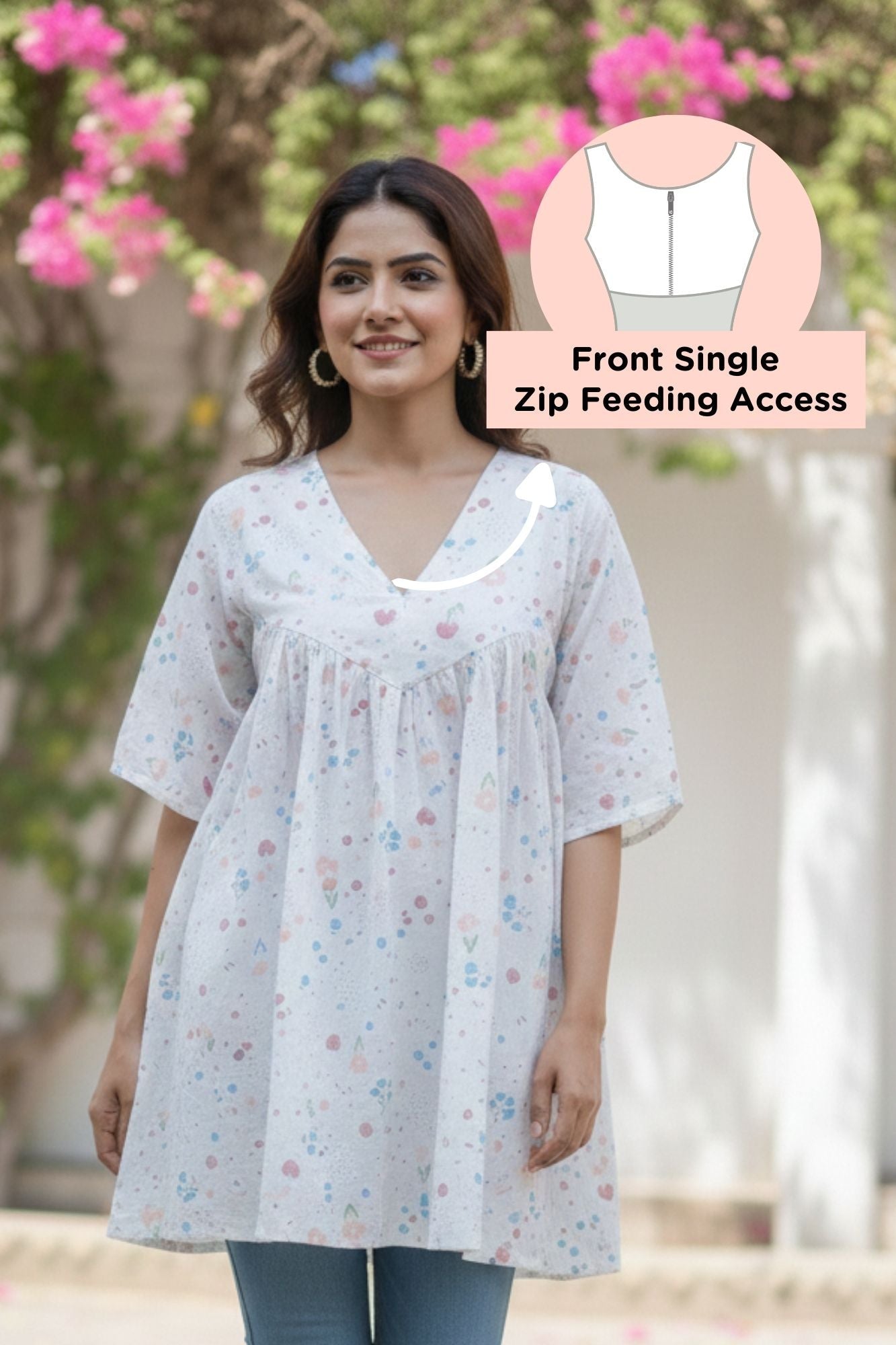 Feel effortlessly stylish in our floral printed maternity top, crafted in soft breathable cotton for all-day comfort. The relaxed design ensures comfort and style through every stage of pregnancy, while the front zipper allows easy and discreet nursing access. Perfect for work or casual outings — pair it with trousers or jeans for an effortlessly chic look.