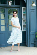 Your wardrobe is not complete without this beautiful maternity striped dress. Made in soft viscose fabric and cut for a relaxed fit, this dress drapes beautifully over your curves allowing space for movement. Featuring a front gathered and an easy nursing front, this dress is ideal before, during, and after pregnancy. Use it as a dress or top and enjoy your pregnancy.