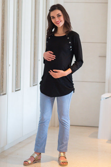Stylishly cut to give chic 3/4th sleeves and poppers on the shoulder, this top grows with you during pregnancy. Extremely soft and stretchable jersey ensures perfect fit through all the pregnancy stages. When the baby arrives, you can feed by unfastening the poppers on the shoulder. Pair it with jeans and jacket in winters or a pair of maternity leggings in summers.