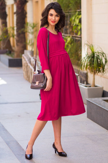 You can never go wrong with this dress that can be worn for any occasion. This dress has a flexible fit during and after pregnancy and flatters the bump with gathers. Made in soft stretchable fabric, you can wear this dress in all seasons. Accessorise it with a neckpiece and an evening clutch and flaunt your confidence!