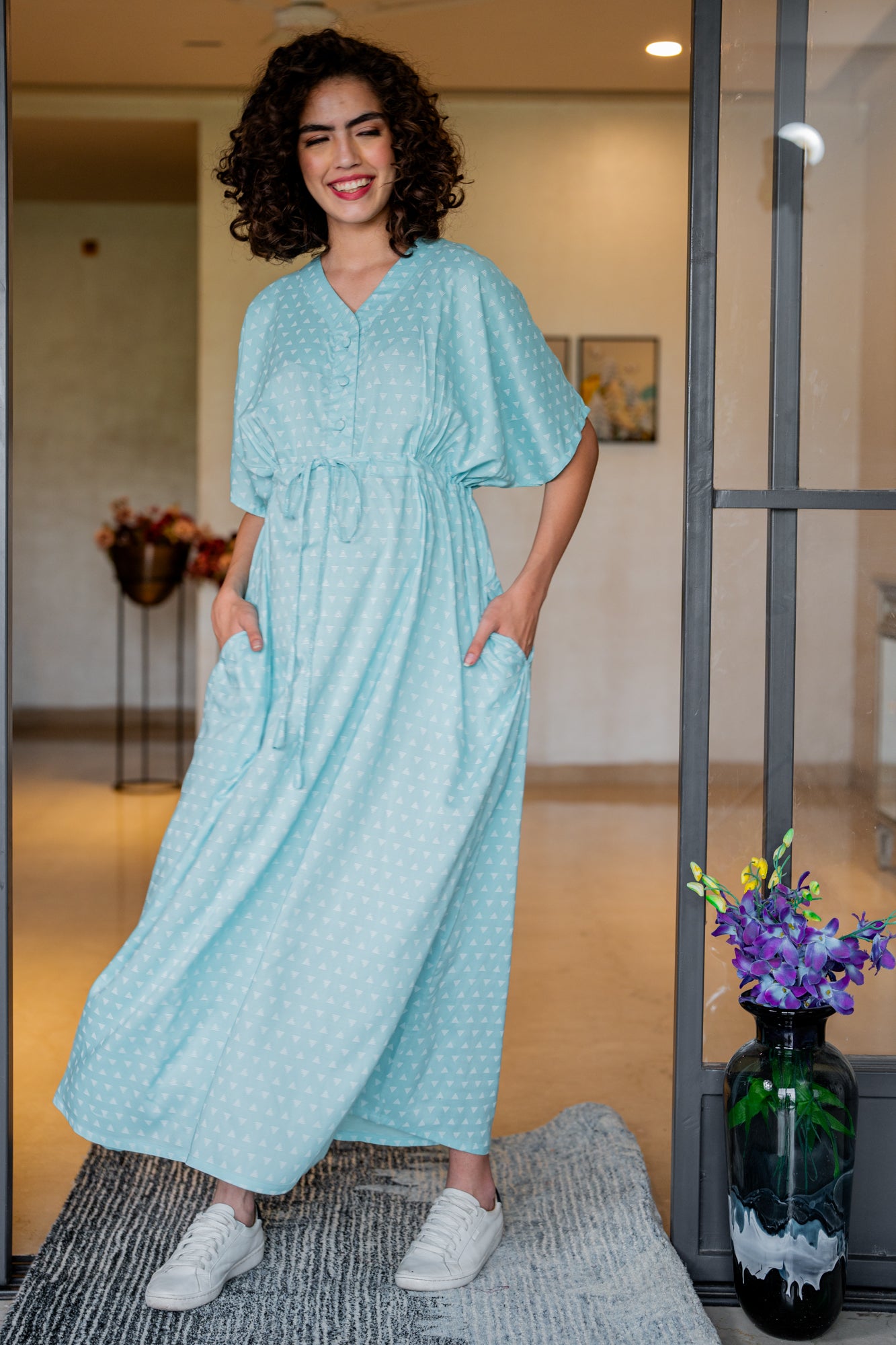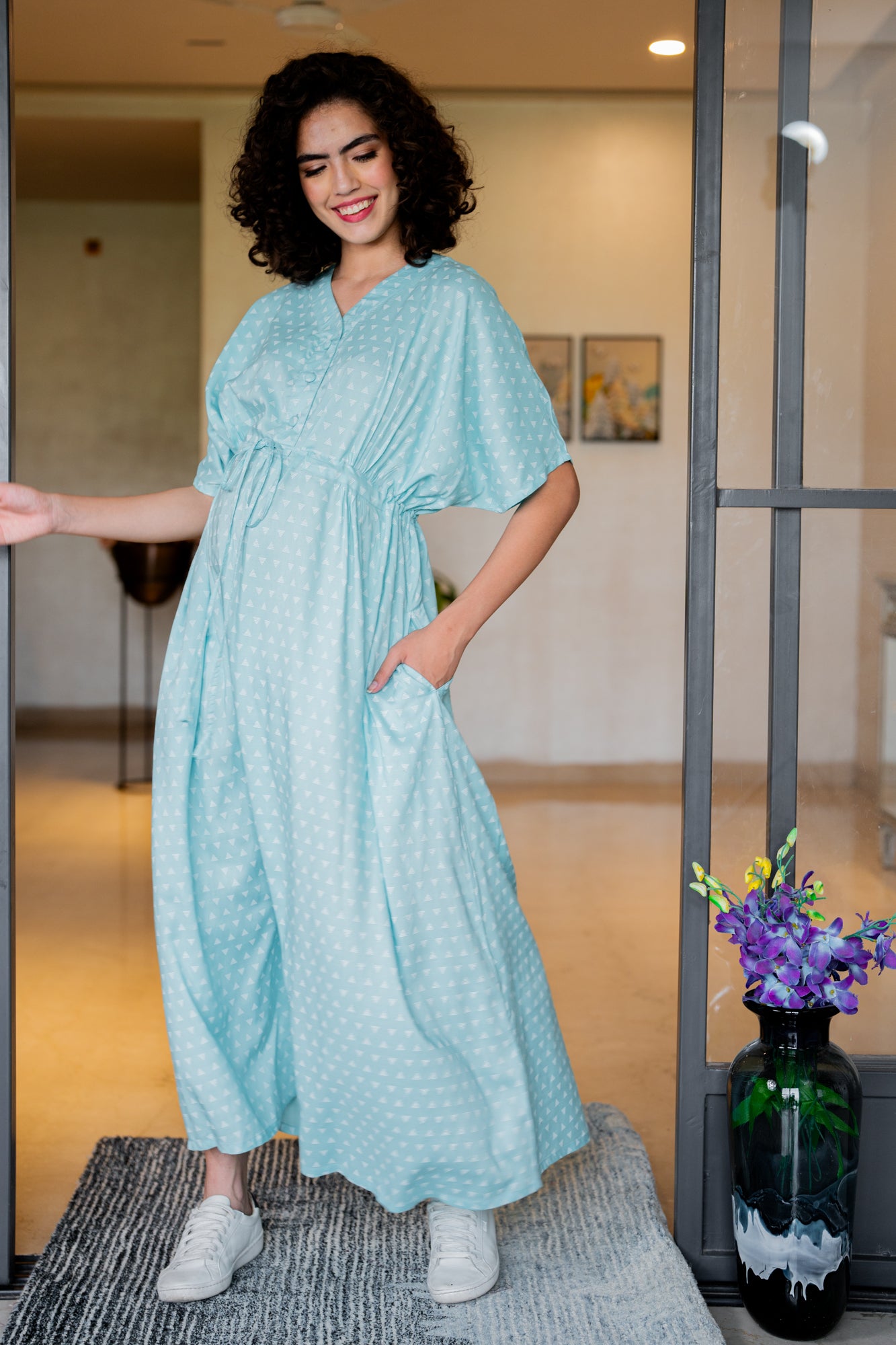 Made in soft viscose blend fabric with a mesmerizing print, the Momzjoy maternity & nursing kimono maxi birthing gown is a true investment in style, function, and comfort. Cascading to the floor, this lined maternity dress has a belt over the bump and stylish kimono sleeves. Our flattering versatile design fits throughout pregnancy and is ideal for your hospital stay or a comfortable sleep.